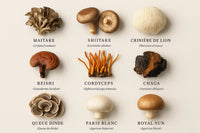 Maitake, Shiitake, Crinière de Lion, Reishi, Cordyceps, Chaga, Queue de Dinde, Paris Blanc, Royal Sun.
